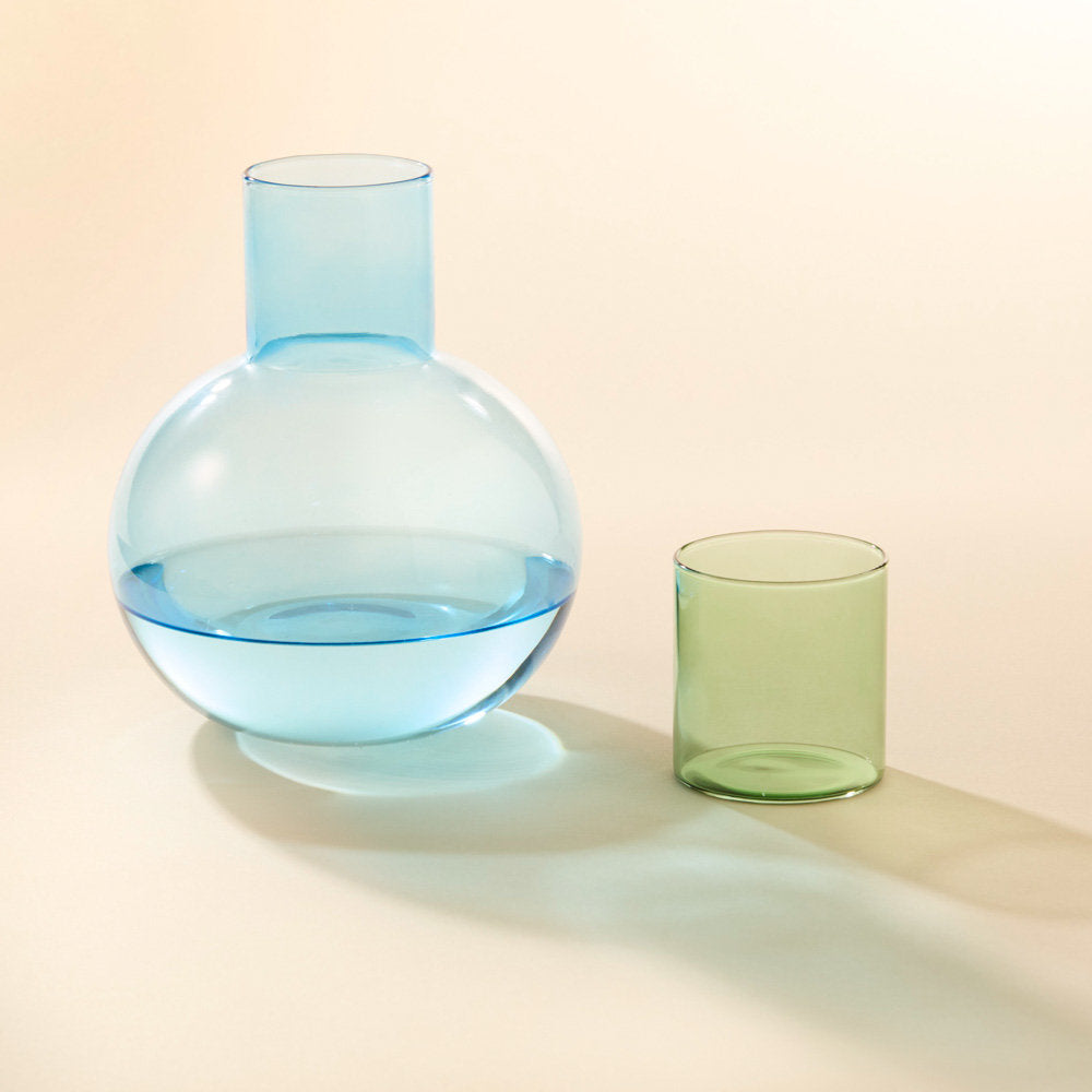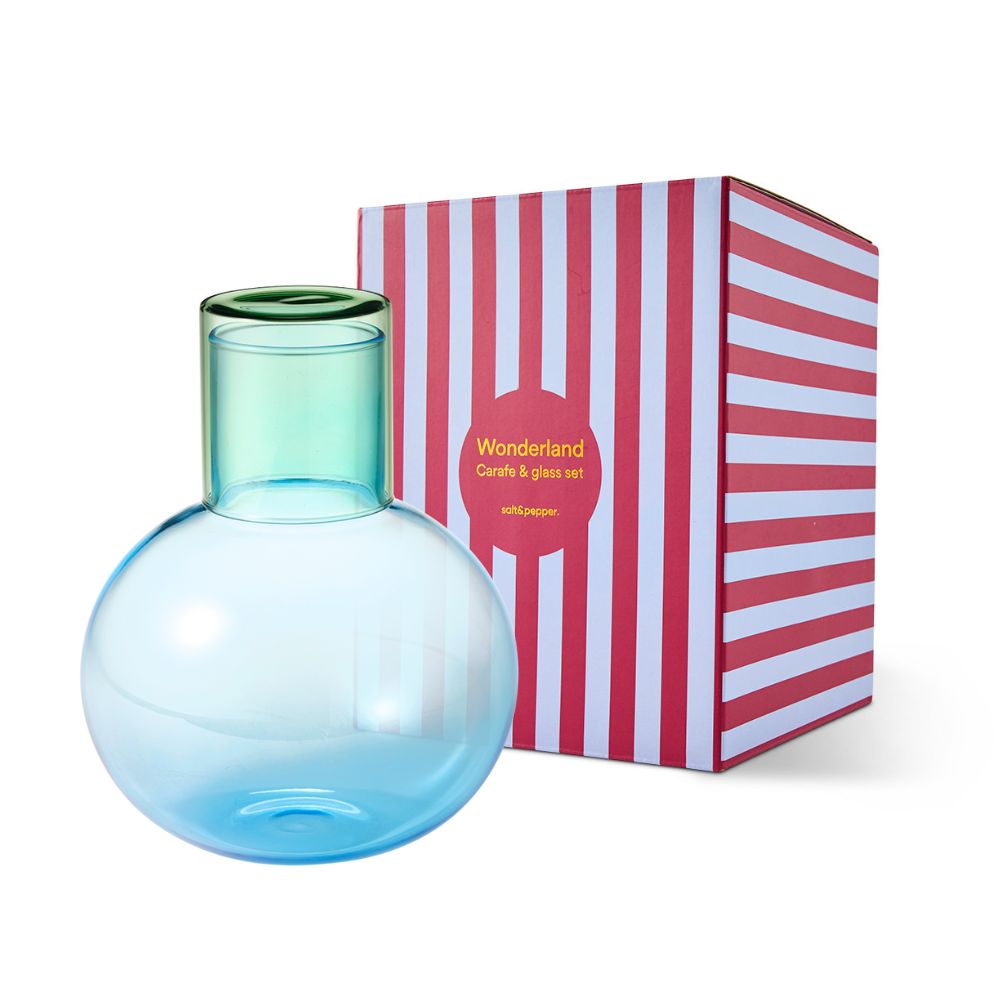 Bring a splash of colour to the holiday table with the vibrant Wonderland glass carafe and tumbler set. Packaged in festive Christmas graphics and ready to gift, this set makes a joyful addition to any holiday celebration or table setting. Ideally sized for a bedside water carafe, this colourful glass set will also brighten your desk for staying hydrated all day.